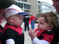 Gavin's 1st baseball game watching the Reds play in Cincinnati. Although we thought the weather "may" not be so great today- it ended up being perfect weather. And, we enjoyed it with several of our friends and their babies/kids too - family day at the ballpark. Gavin wore his new Cincinnati Reds t-shirt and the baseball hat from Grandma Janet- the perfect little fan. We hope you enjoyed your first baseball game (and thanks to the Baby Bjourn for a great trip too) Gavin - I have a feeling there will be many more to come... (possibly even a trip up to Detroit to see the Tigers play???).